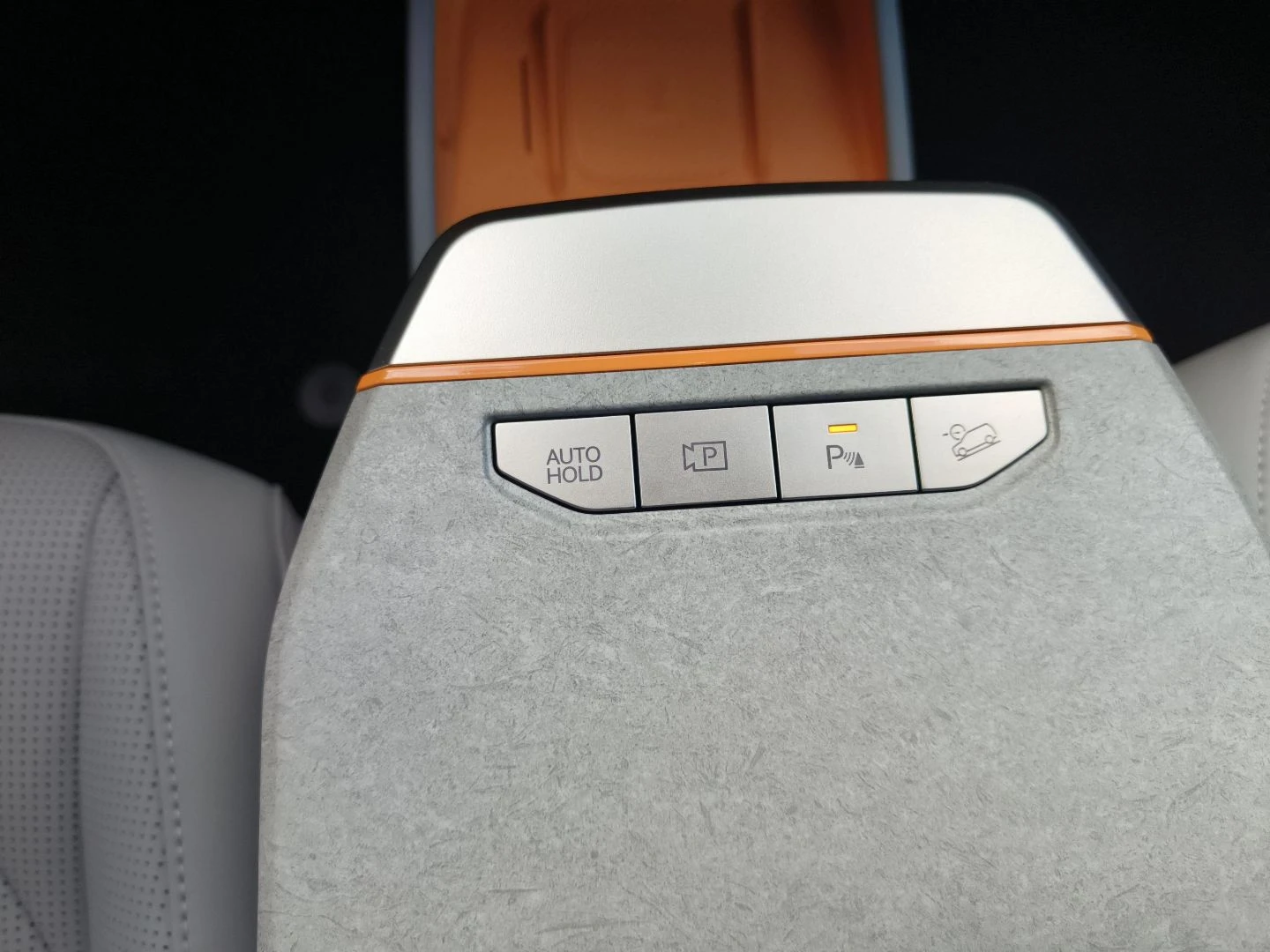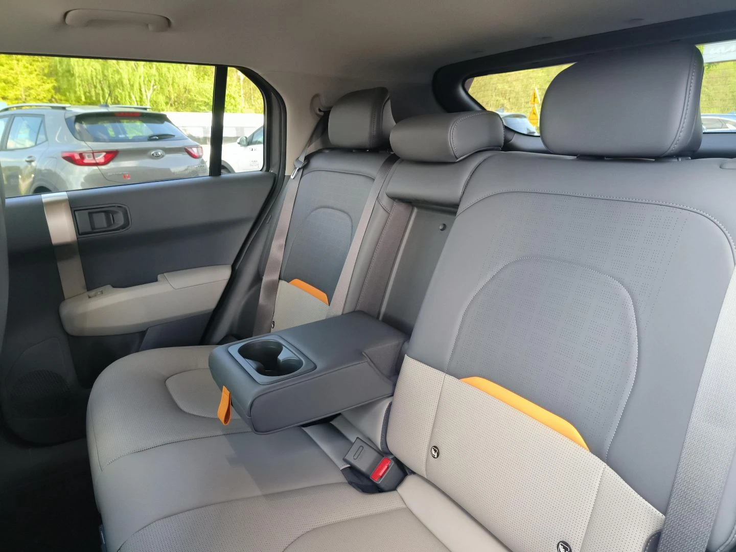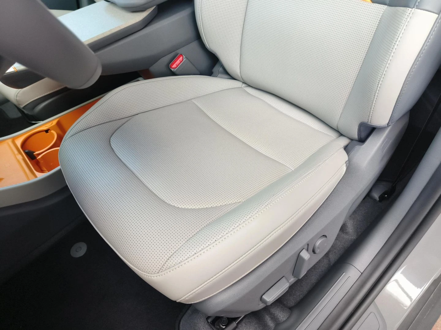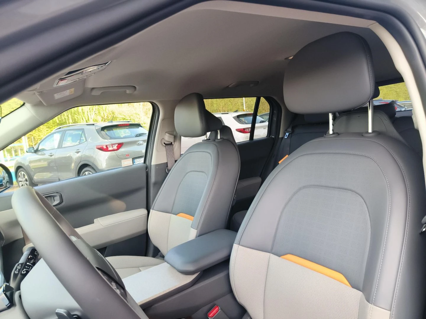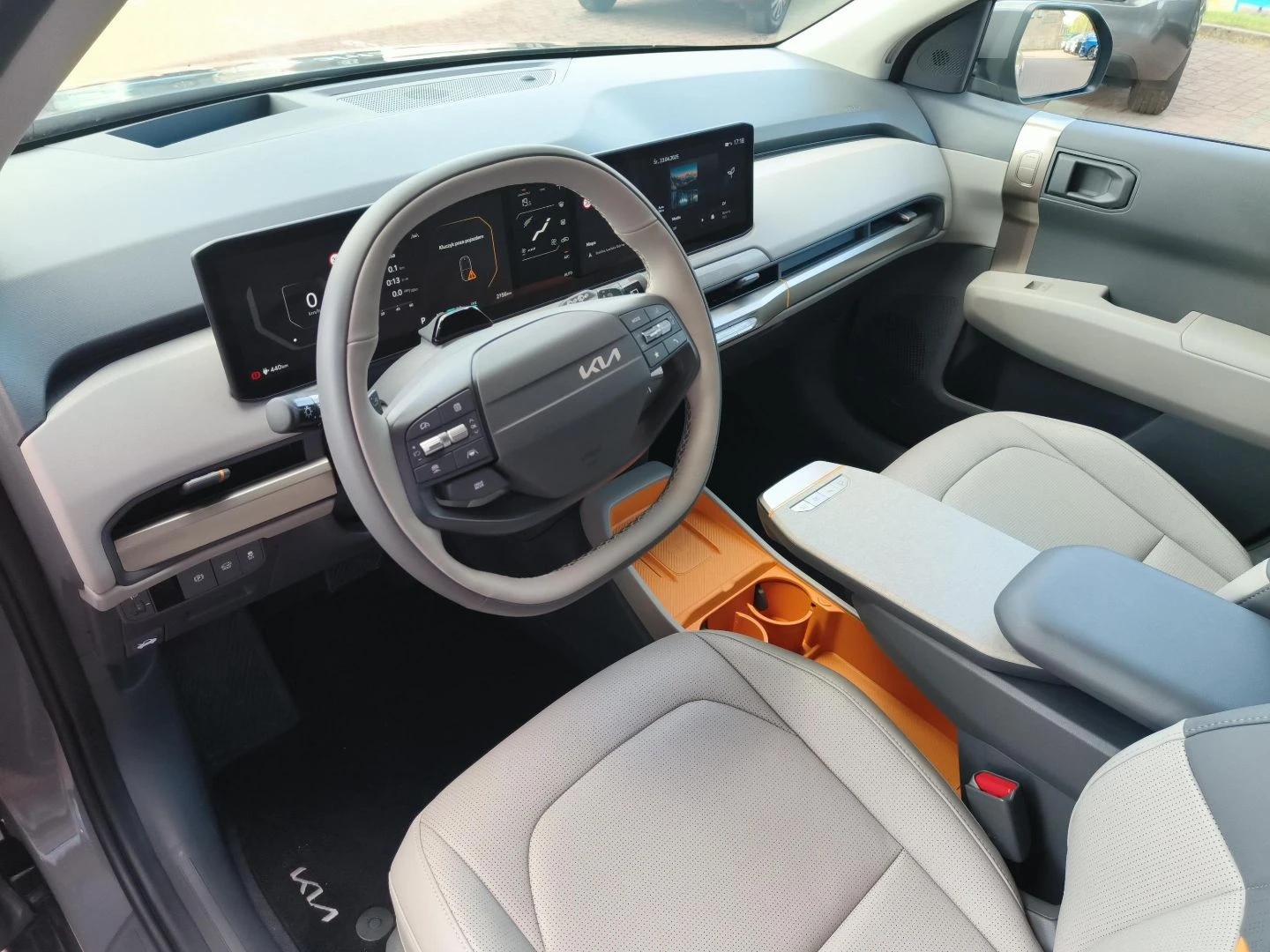 ▪ Wegańska tapicerka skórzana w kolorze grafitowo-jasnoszarym z pomarańczową wstawką w oparciu przednich foteli i tylnej kanapy oraz pomarańczowym wykończeniem schowka z przodu