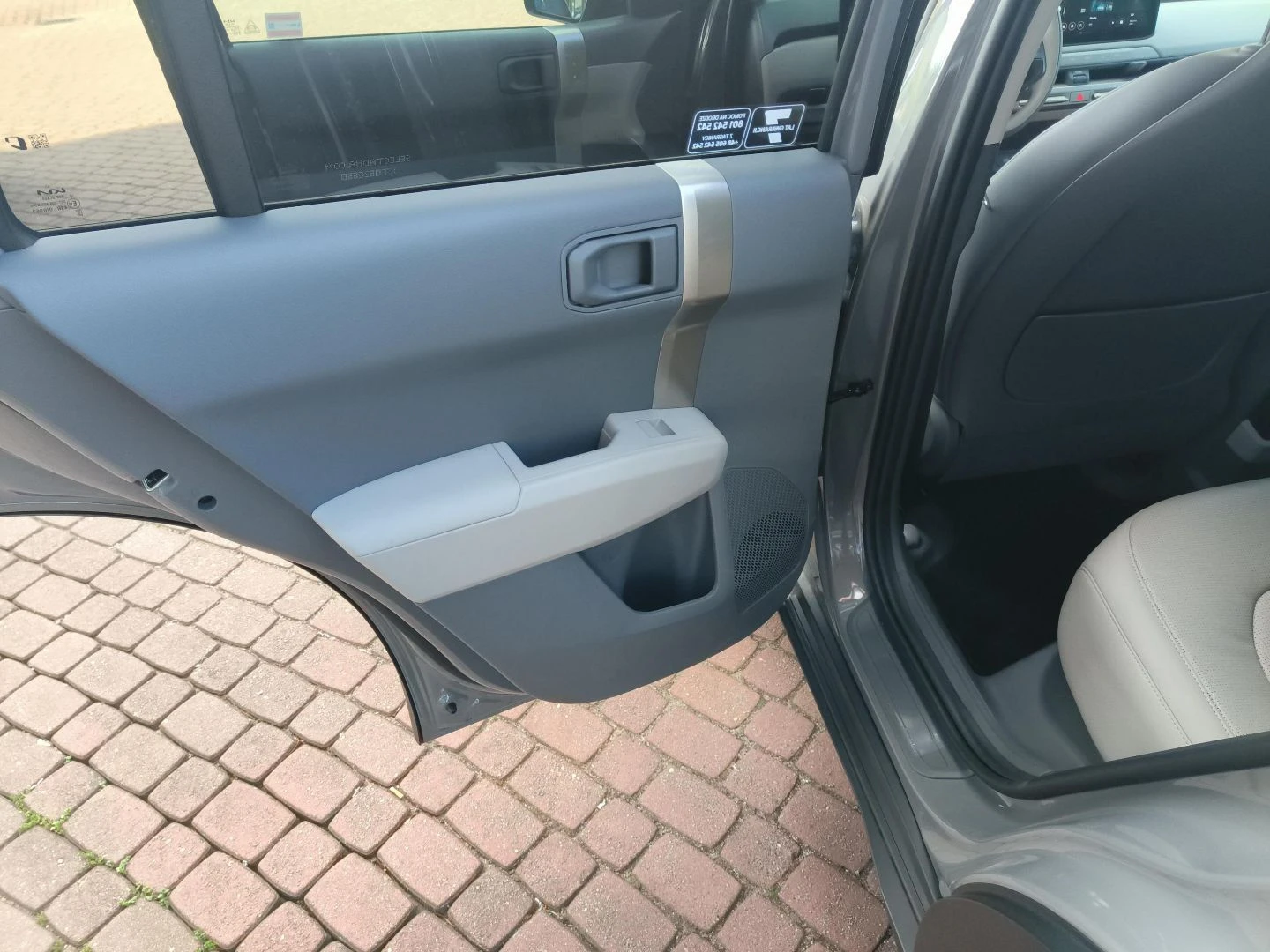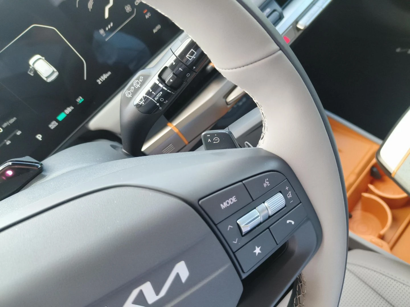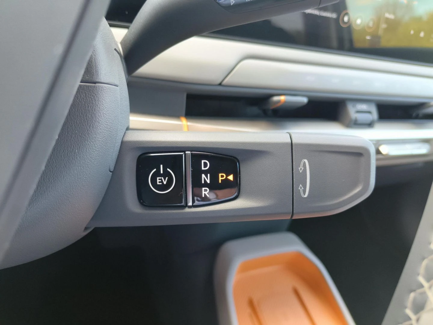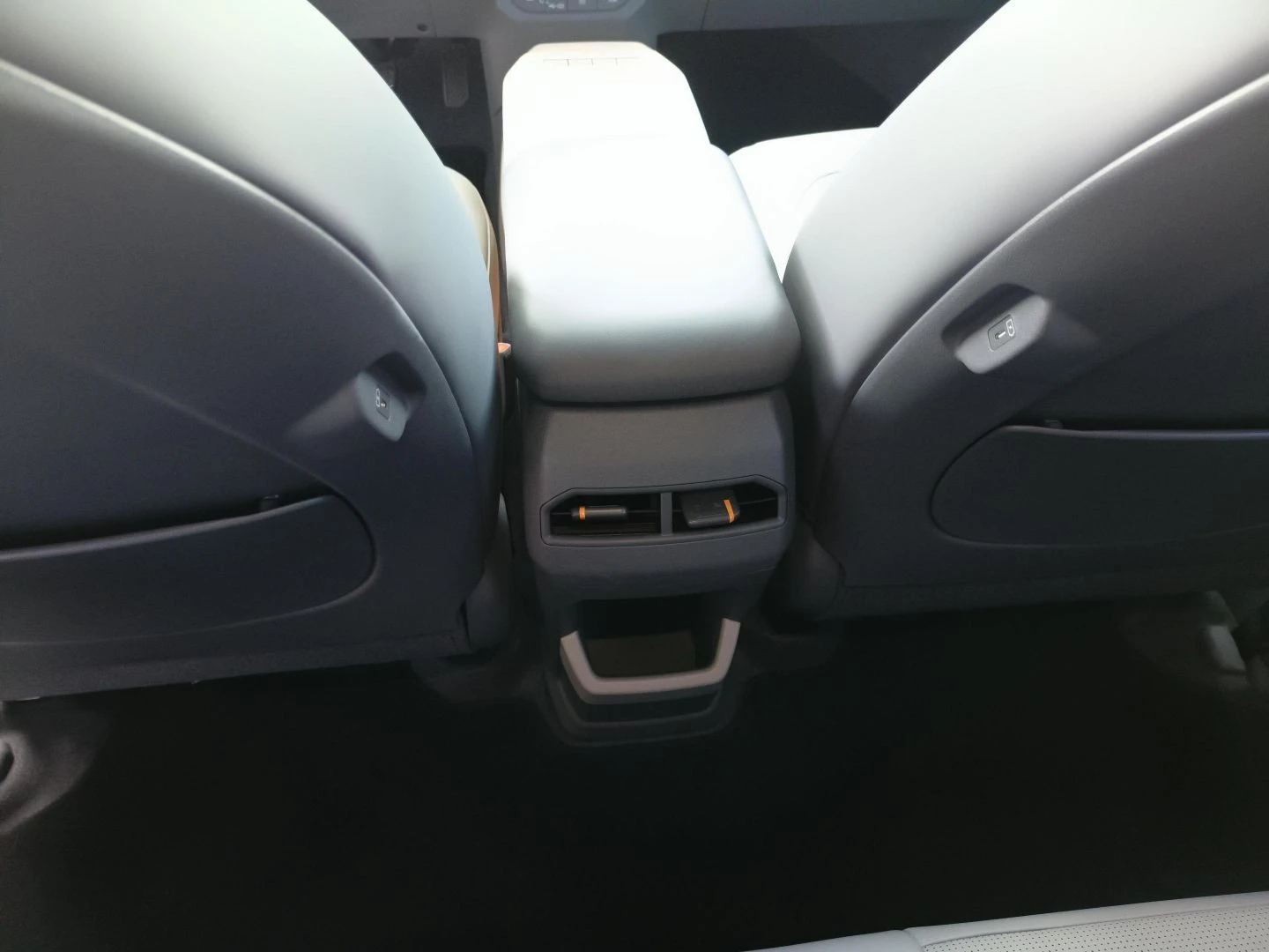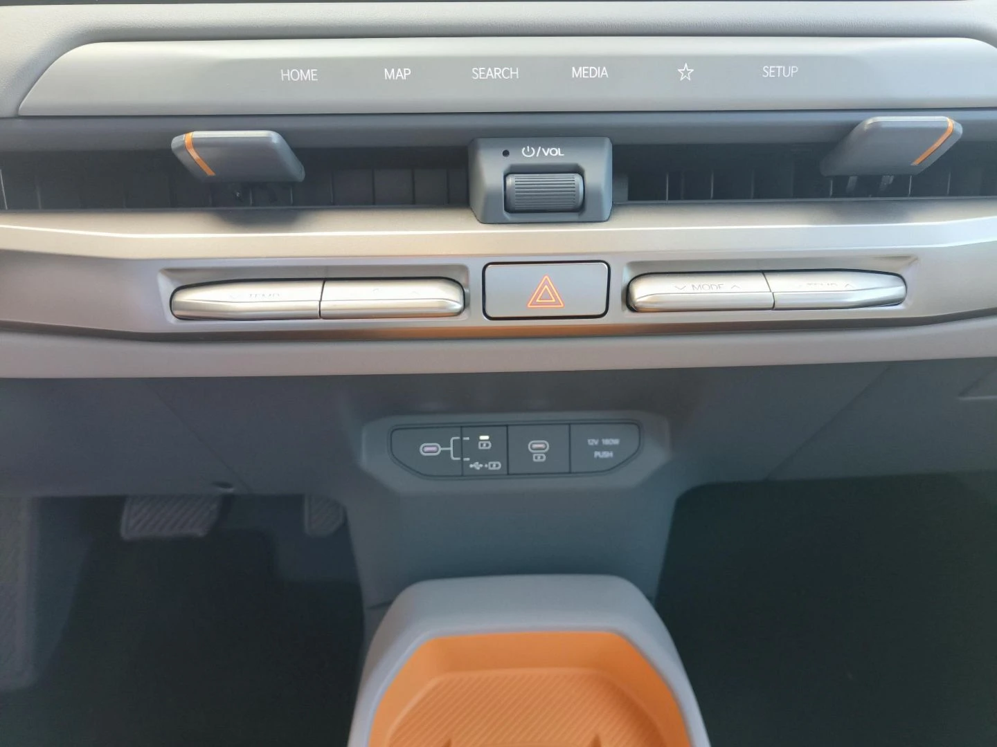 ▪ Wegańska tapicerka skórzana w kolorze grafitowo-jasnoszarym z pomarańczową wstawką w oparciu przednich foteli i tylnej kanapy oraz pomarańczowym wykończeniem schowka z przodu