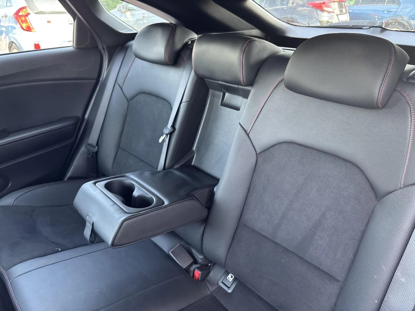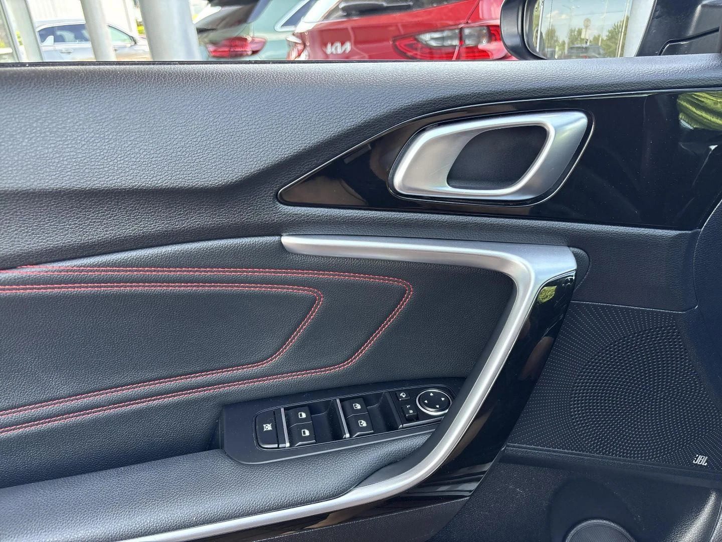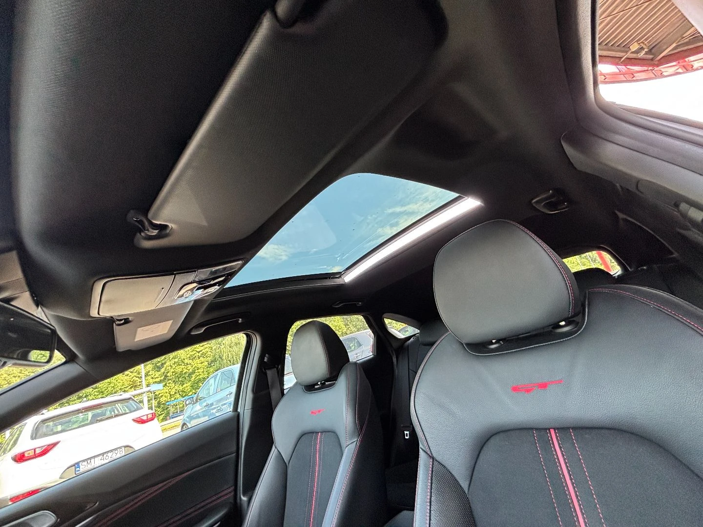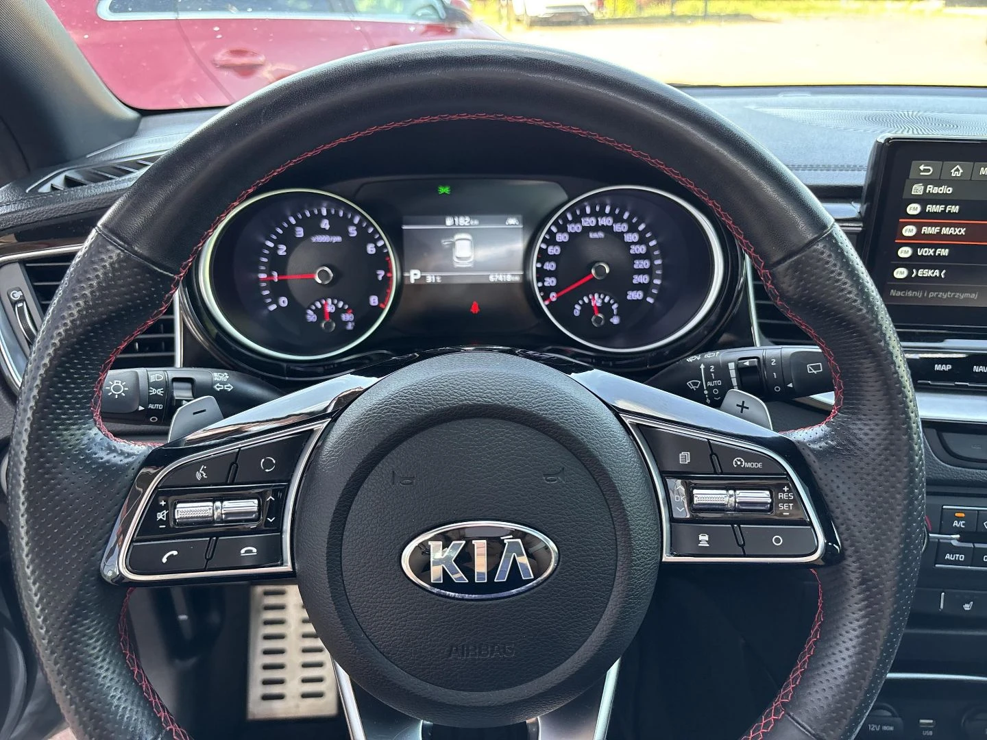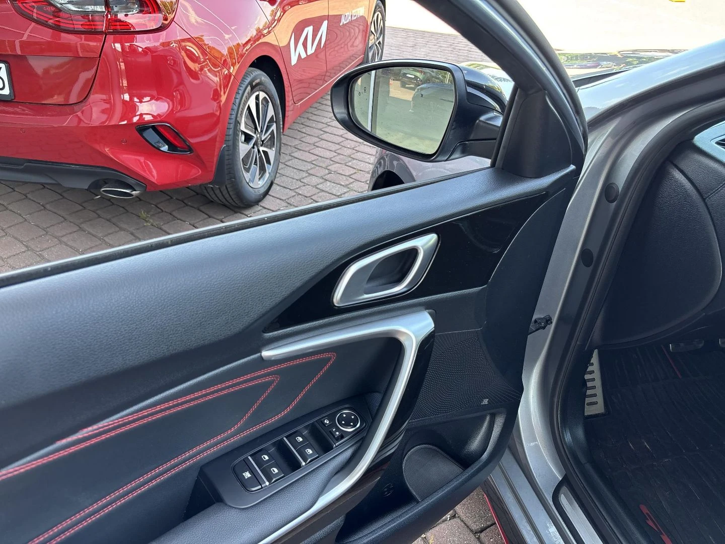Czerwone przeszycia foteli, boczków drzwi i kierownicy