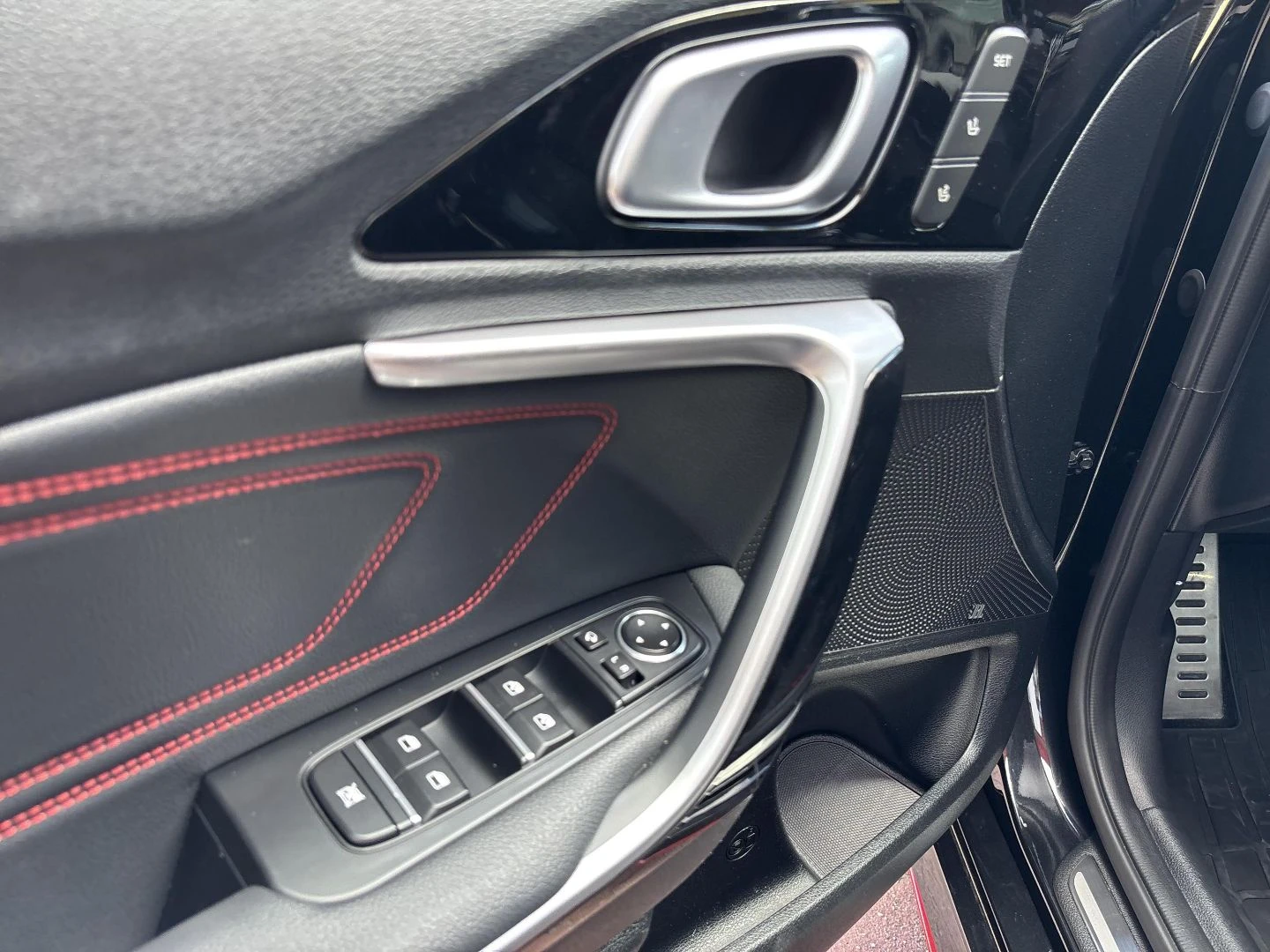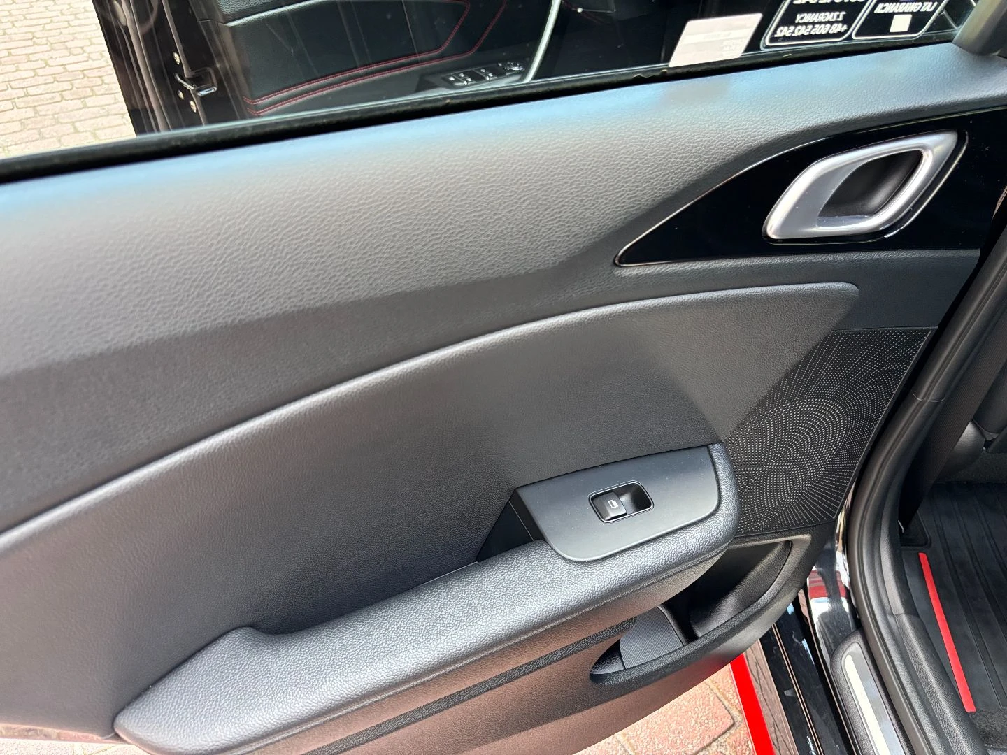 Czerwone przeszycia foteli, boczków drzwi i kierownicy